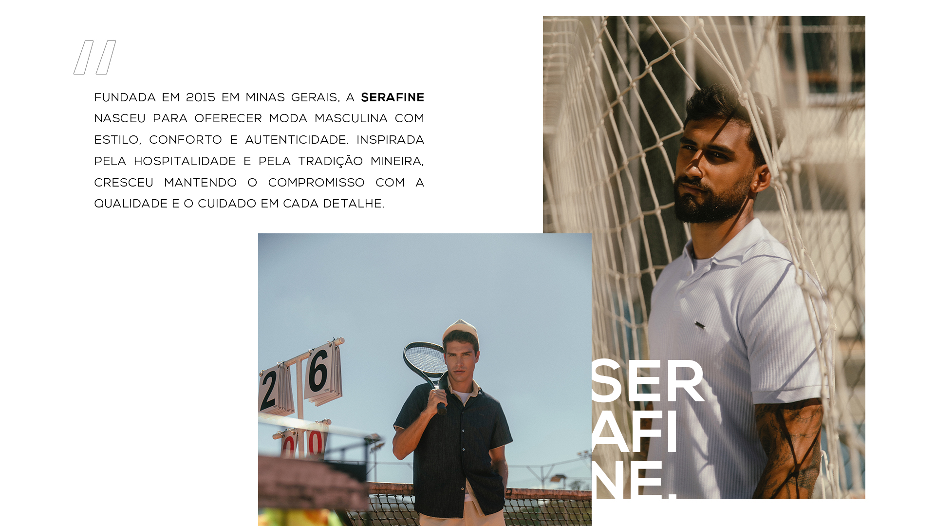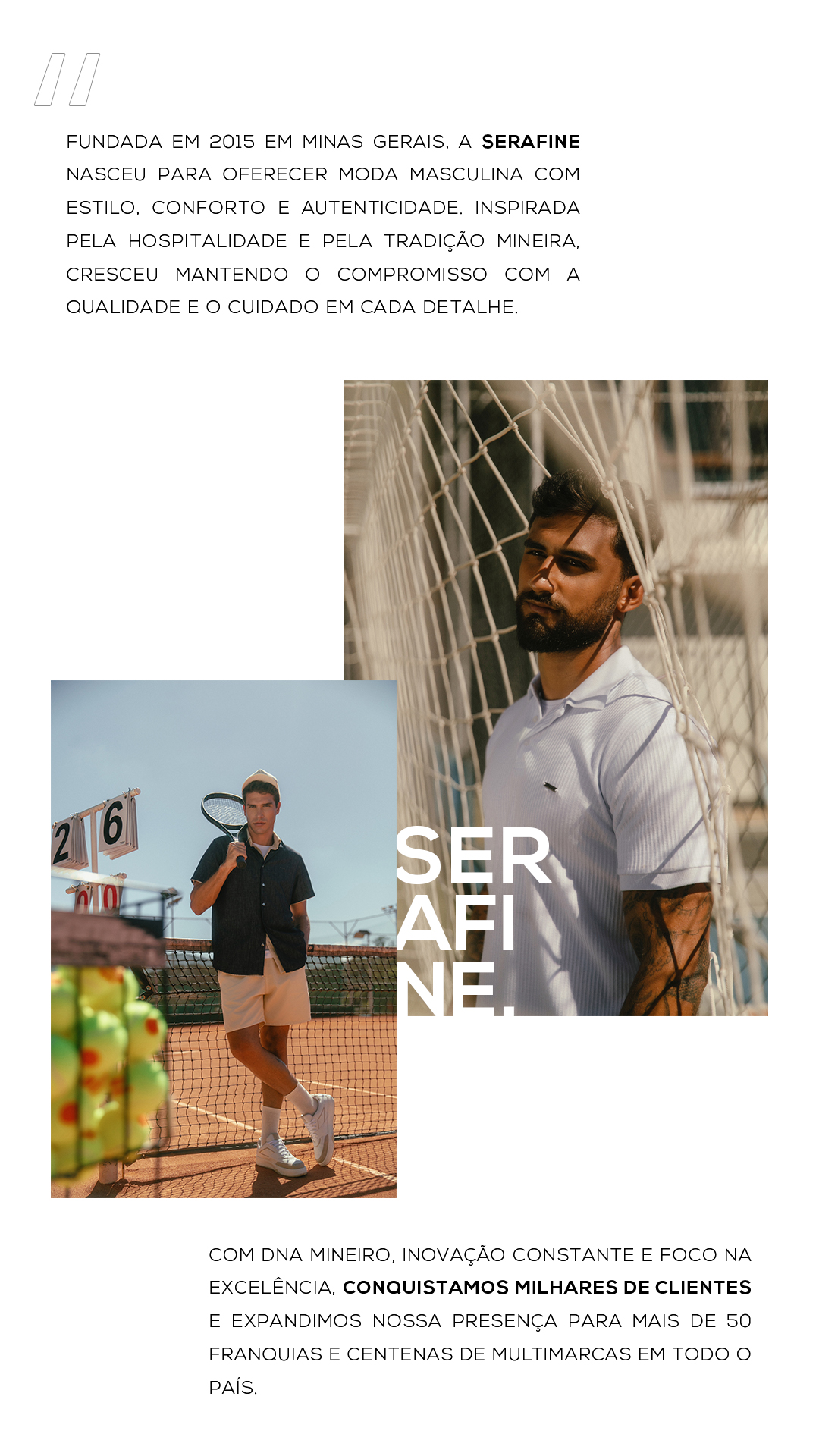 Na SERAFINE, cada coleção é pensada para unir inovação, tecnologia e sustentabilidade em peças que traduzem o melhor da moda masculina contemporânea. Nosso mix oferece roupas com design atual, conforto incomparável e qualidade que se mantém no dia a dia, sempre com práticas responsáveis que cuidam do futuro do planeta. Um portfólio completo para atender diferentes estilos, idades e momentos do homem moderno.